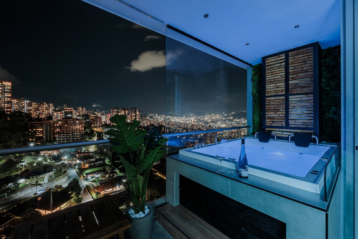 Great pool area on building´s terrace Jacuzzi, Steam and Gym Restaurant/Bar Lounge in lobby. Room service Balcony with Priv. Jacuzzi /Queen size bed AC Separate Bedroom-Living Room Comfort and spacious in contemporary design. Complete kitchen Great view of city and mountains. Close to Provenza best bars/restaurants in city. Clothes washer and gas dryer in apartment. Energy Living iconic building in Medellin Private jacuzzi in Balcony 11th Floor 1.000 Sq. Feet Fast Wifi 24/7 check-in