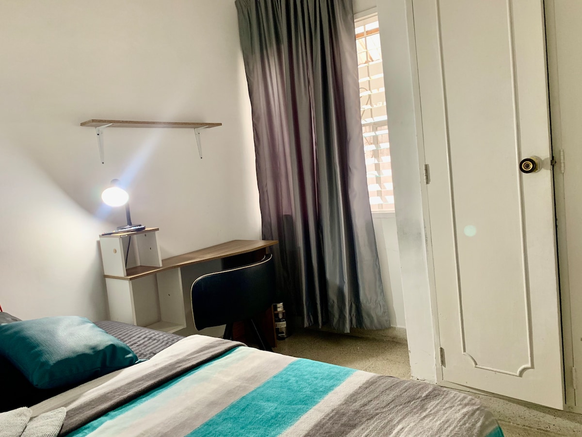 Room with 1 King bed + 1 Twin bed or 3 Twin beds. Bright and stylish with a renovated colonial design, featuring a private bathroom, safe, and daily breakfast. Perfect for families, couples, and digital nomads seeking comfort and cultural connection: enjoy our coworking area with high-speed internet. Relax in the lush indoor patio, TV lounge, shared dining room, and fully equipped kitchen. Just steps from the metro, restaurants, and bars. Laundry service available upon request.