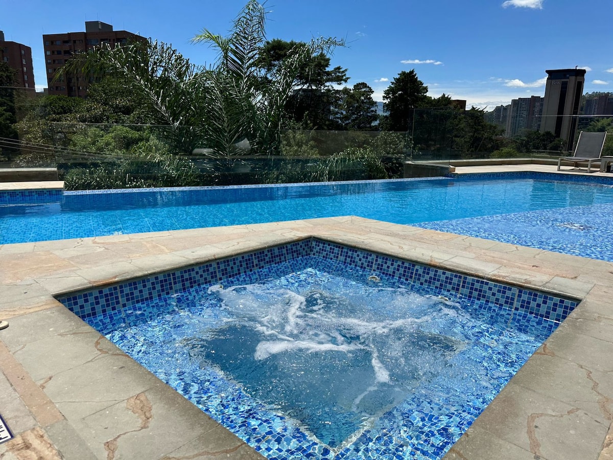 You will be in a private Jacuzzi in the sky!!! , El Poblado, 300 MBPS Internet, HD TV, free parking, great place for working REmotel and those who want to enjoy their holidays, you will be just 7 mins by UBER to Provenza. Walking distance you find train station. Oviedo and Santa Fe Shopping malls, 24/7 grocery store and ATM just around the corner, Building has Gym, CoWorking area, Breakfast (Optional). The best place to stay in Medellin. Unique private Jacuzzi and terrace MEDELLÍN! RNT253422