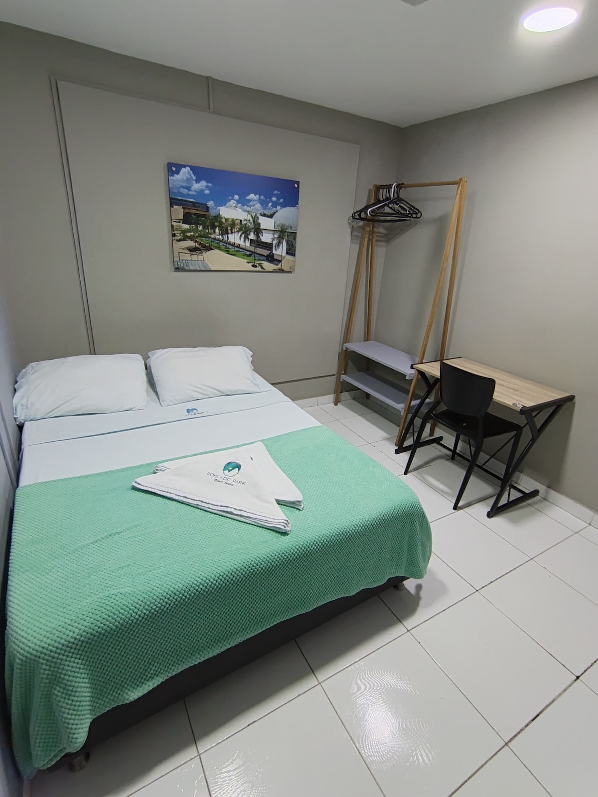 Double room with private bathroom inside the room, closet, desk, fan, furniture and ample space. A PLACE TO REST In our rooms you will find the comfort you need in a quiet environment feeling at home. We have common areas such as a fully equipped kitchen, 500MB quality internet, a gas water heating system, a living room with access to flat screen TV and a relaxation area with hammocks.