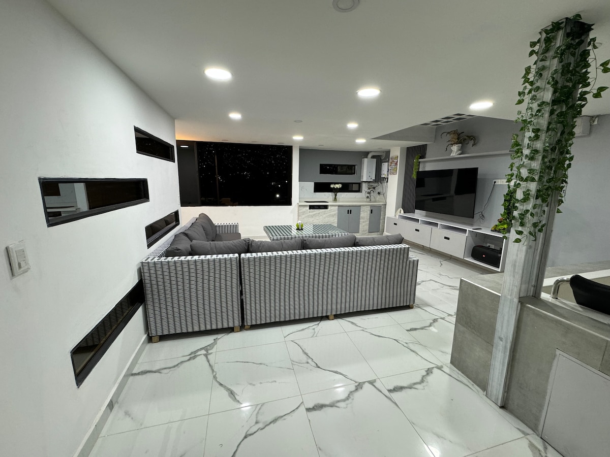 A charm of luxe 3-floor gem in Medelin North.Unique in the area,Amenities for ultimate relaxation.Delight in the Patio rooftop with BBQ, kitchen,Priv. Jacuzzi, and speakers. Each bedroom w/double beds, private bathrooms,closets, TV. Enjoy the luxe of common areas, lavish dining and living room, Cozy TV room. Sofa, beds & pillows of high comfort. Prime location,close to Metro stations,supermarkets, restaurants, and vibrant nightlife, 20 Min from Poblado. Unwind without worry about traffic. 3 A/Cs