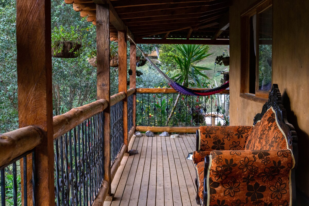Recárgate de buenas energías mientras te conectas con la naturaleza en este hermoso chalet ubicado en Santa Elena. Con la mejor compañía de tu familia o amigos, podrás admirar una vista única del Occidente antioqueño con sorprendentes atardeceres y noches estrelladas. El confort y la tranquilidad son clave. El chalet cuenta con baño privado al aire libre y agua caliente; dos camas (King y Queen) con lenceria de alta calidad. También tiene un deck privado con malla relajante, chimenea y minibar.