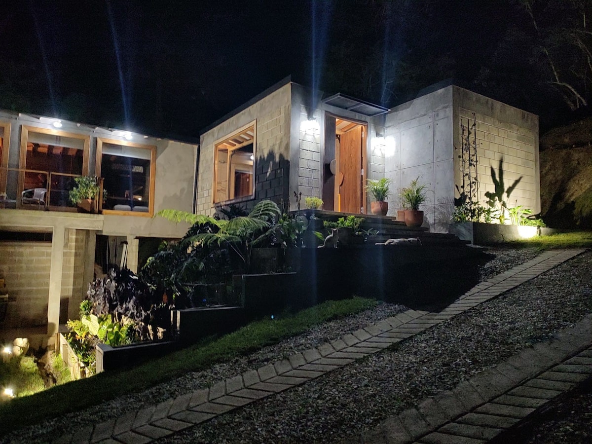 Cabaña privada de diseño fresco y acogedor a 25 minutos del centro de Medellín, y a 15 minutos del parque natural Arvi con transporte publico hasta la puerta de la casa, bastante iluminada con vista a la ciudad, se comparte la entrada y la terraza, brinda tranquilidad y contacto con la naturaleza, perfecto para estudiar o trabajar por internet (velocidad del Internet 300mg) para los que les gusta el paisaje natural, los pájaros libres, la chimenea. En un espacio rústico y sostenible