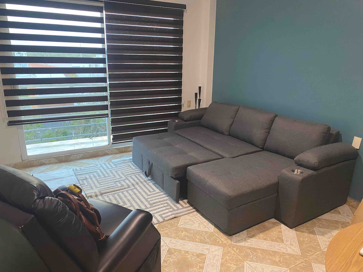 Departamento recién remodelado completamente amueblado con todos los servicios. Recámara enorme con cama king size climatizada, sala con cómodo sofá cama tamaño matrimonial, barra de granito para comer, cocina integral con todo lo que necesitas para cocinar, Wi-Fi, smart tv con cuenta de netflix para uso exclusivo. Café, té y botellas de agua de cortesía. Super ubicación a 5 minutos de Plaza Américas, Plaza Andamar y Plaza Vela. A 15 minutos a pie de la zona costera de Boca del Río.