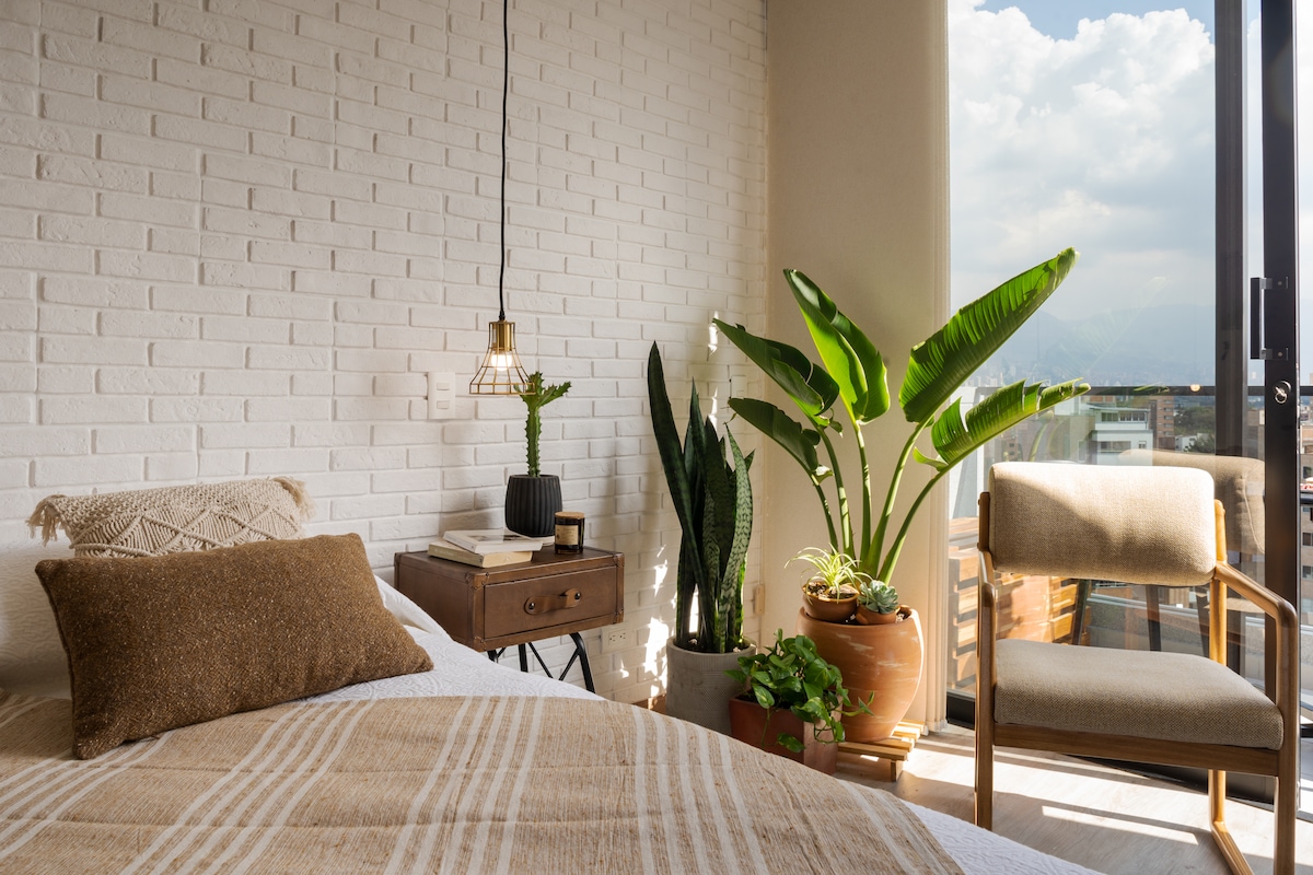 Fully renovated loft designed by Satori Creations in the heart of Poblado-Medellin: ☞ King bed ☞ Air conditioning ☞ Doorman 24/7 ☞ High-speed WiFi 400 Mbps+ ☞ Flat area of Poblado W/distance to Parque del Poblado|Provenza|Manila|Parque Lleras ☞ 8th floor with elevator ☞ 55” Smart TV ☞ Balcony ☞ Monitor ☞Safe ☞ Washer-dryer ☞ Access Metro|Uber ☞ Luggage storage at checkin/out ☞ Free parking ☞ Yoga & meditation room at the Rooftop ☞ Best Restaurants|Markets|Bars|Discos|Coworkings|Coffees