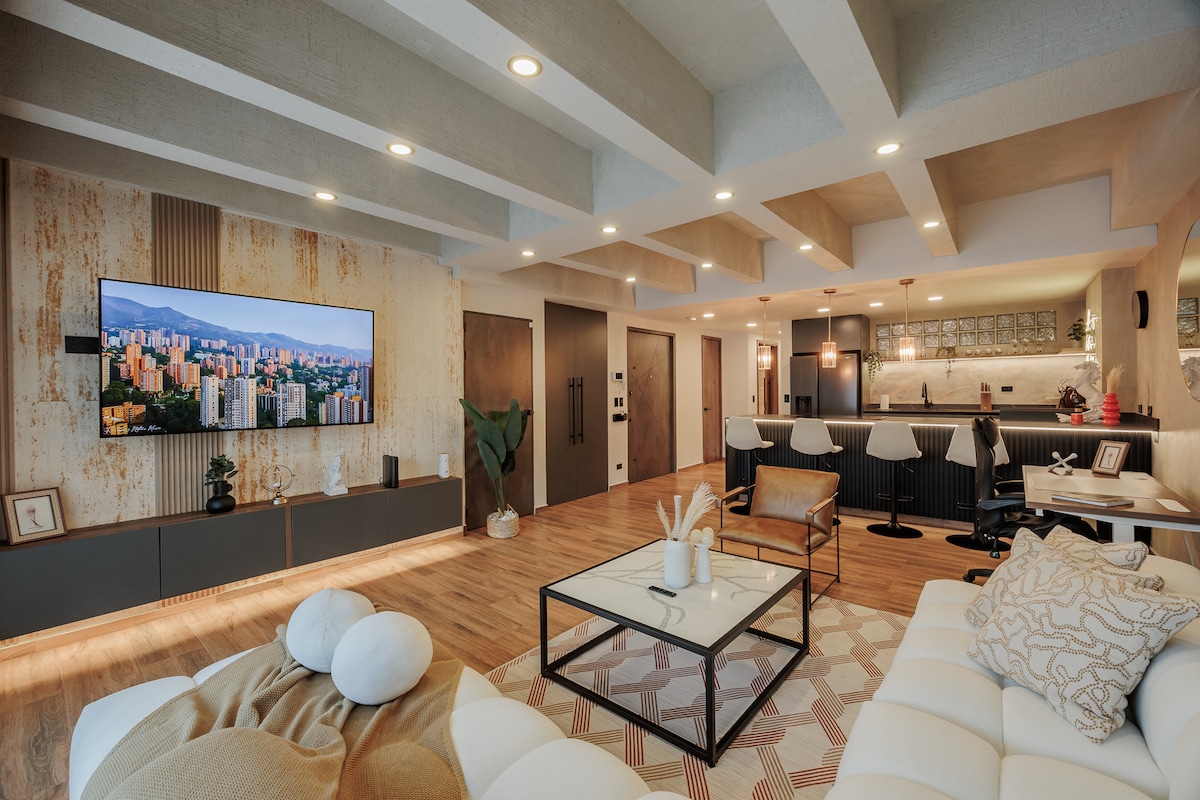 Welcome to our luxurious 26th-floor penthouse, where elegance, comfort, and unparalleled views come together in the heart of Provenza. This stunning space is designed for those who seek the finest in city living. Our open-concept design seamlessly integrates the kitchen, living room, and balcony into one expansive area, perfect for relaxation. A private balcony with a luxurious soaking tub offering the most spectacular views of Medellín’s skyline and the lush surrounding mountains.