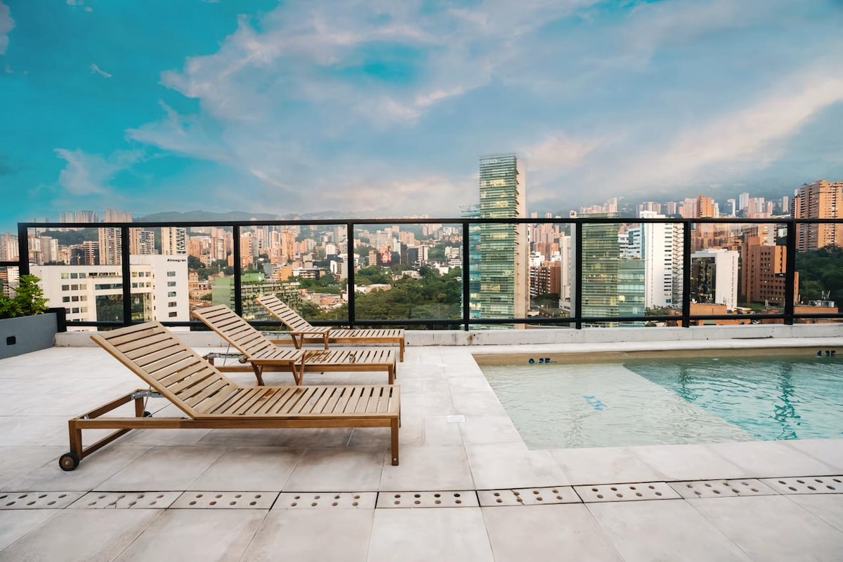 Take it easy at this unique and tranquil getaway. This beautiful, modern new 50 m² studio is ready for you. Workspace, 300 MG wifi speed, A/C, 1,5 bath, will be the perfect getaway for a couple. Near to a park, 200 mts from ATMs, Grocery stores, Restaurants and Cafes. 10 minutes walking to the night party in Provenza and Park Lleras. King bed, amazing view from 8th floor, gym in the building and parking load, security 24/7. *Zero tolerance against sexual tourism. *Please see our house rules.