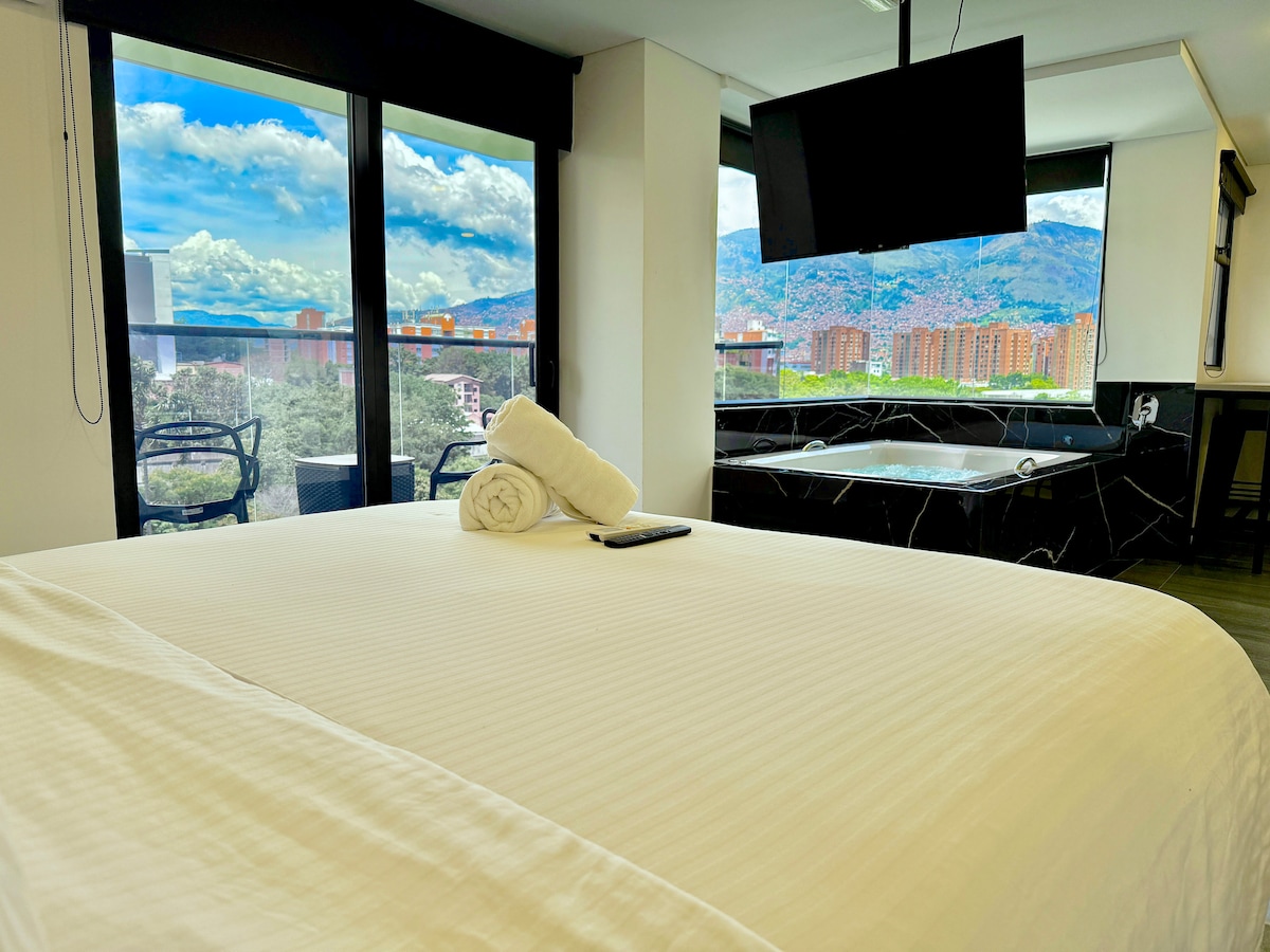 Experience Medellín from above in this luxury 1 BD apartment on the 24th floor, with premium finishes, skyline views, and total comfort. Enjoy a private Hot Tub, spacious living area, fully equipped kitchen and 5 stars amenities. -Private Hot bath tub -AC -Blackout remote control -High Speed Wi‑Fi/800MBs -Pool+Jacuzzi+Turkish bath -FREE in-unit washer/dryer -On-site restaurant & SPA -Full gym 24/7 -Workspace -FREE co‑working space -24/7 lobby & security -No Airbnb fees