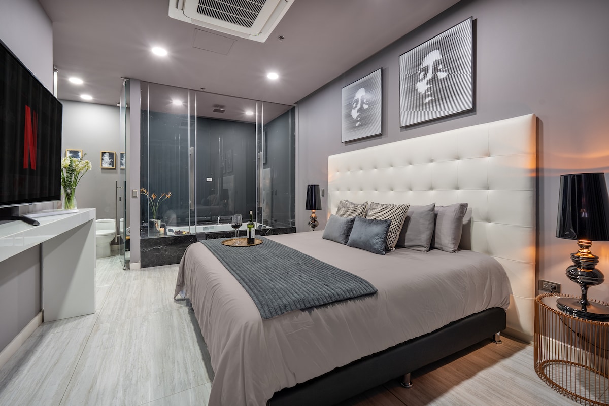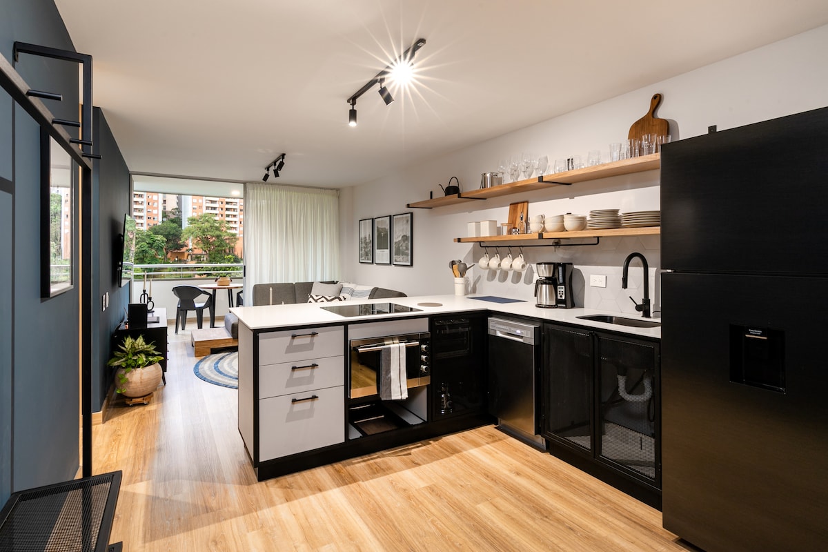 Brand new building (Hotel Urban Studios) & luxury apartment located in the best sector of El Poblado (El Tesoro), is perfect if you are looking for a peaceful and beautiful space. - Luxury interior design, furnishings - Spectacular views from Living Room, Bedroom, & Office - Full Washer & Dryer - Air conditioner In the Bedroom - 55¨Smart TVs LG - 200GB+ Wifi - Heated Pool & Jacuzzi - Steam Room - Complete modern gym - 24-hour security