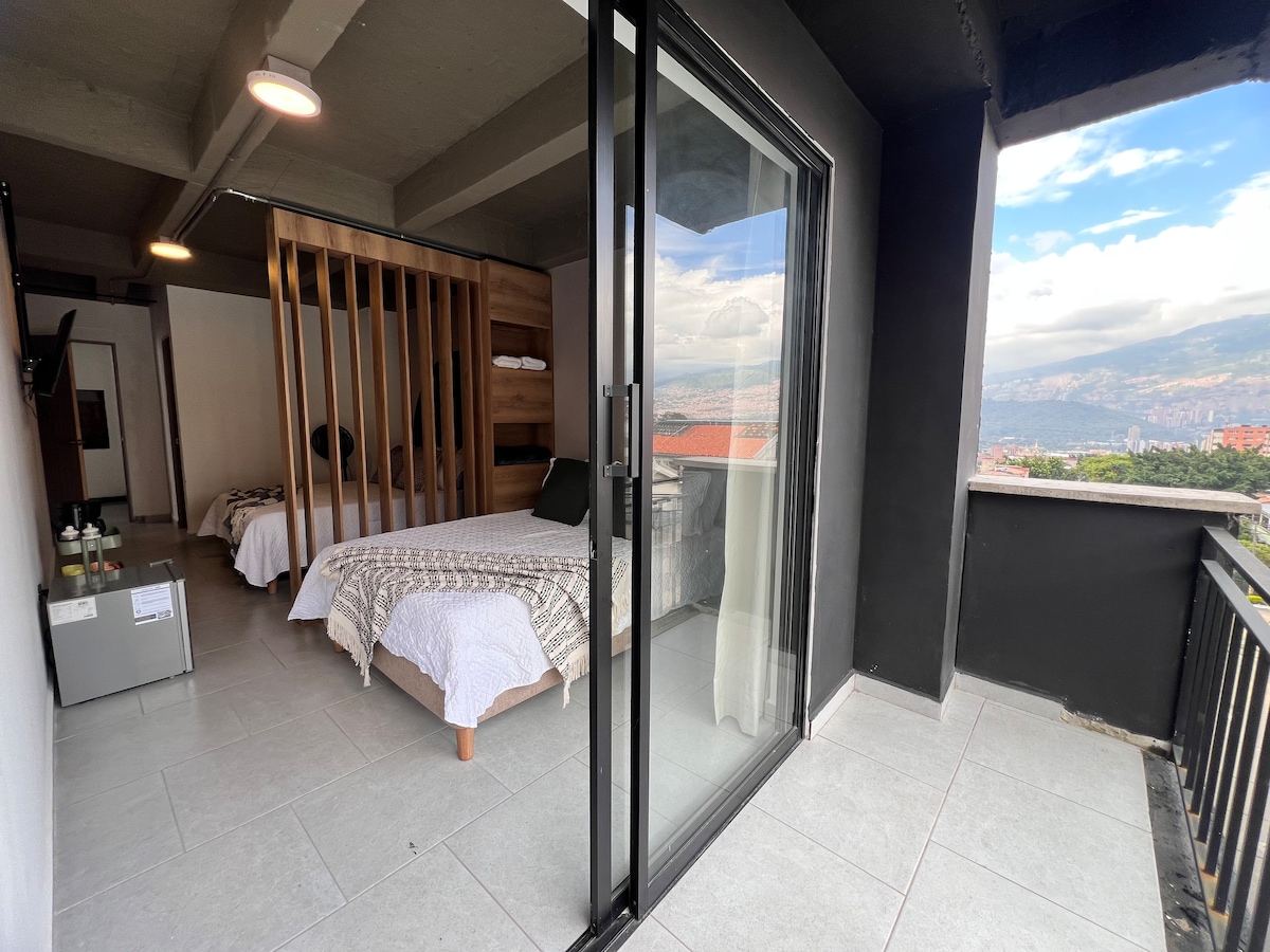 Modern 32m2 room with 1 queen bed, private bathroom and walk-in shower. The room has a working desk, spacious closet and fully equipped kitchen with medium fridge, microwave, coffee machine and electric oven. This room has panoramic views of the city as well as tree canopy views. Nomada is located at Manila, one of the trendiest neighborhoods in Medellin with Poblado Metro station 5 min walk, Provenza & Parque LLeras are about 15 min walk. restaurants & coffee shops are walking distance as well