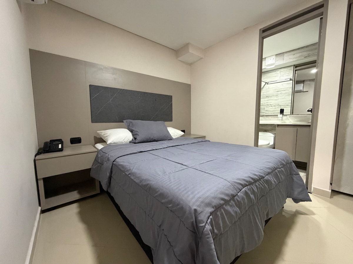 Con un amplio espacio de 23m2, cuenta con una acogedora alcoba, una zona de entretenimento perfecta para relajarte, un balcón para disfrutar de una espléndida vista, cocina equipada, un cómodo escritorio para trabajar; amplio vestier para organizar tus pertenencias, lencería de calidad y un baño completo para tu comodidad. Cuenta con cajilla de seguridad, plancha y mesa para planchado.