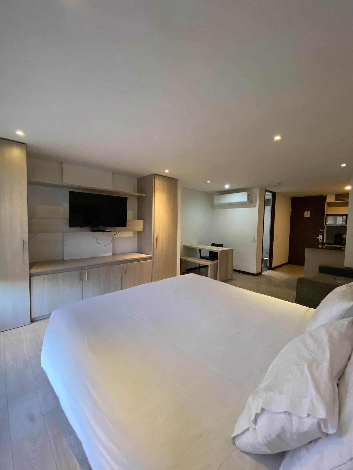 - Loft acondicionado para personas con mobilidad reducida. - 37 m2, - Vista a la ciudad - Nevera - Cama King size, televisor por cable, - Escritorio de trabajo, closet, caja fuerte, - Aire acondicionado, - baño privado que incluye toallas - implementos de aseo y agua caliente. - NO TIENE COCINA.