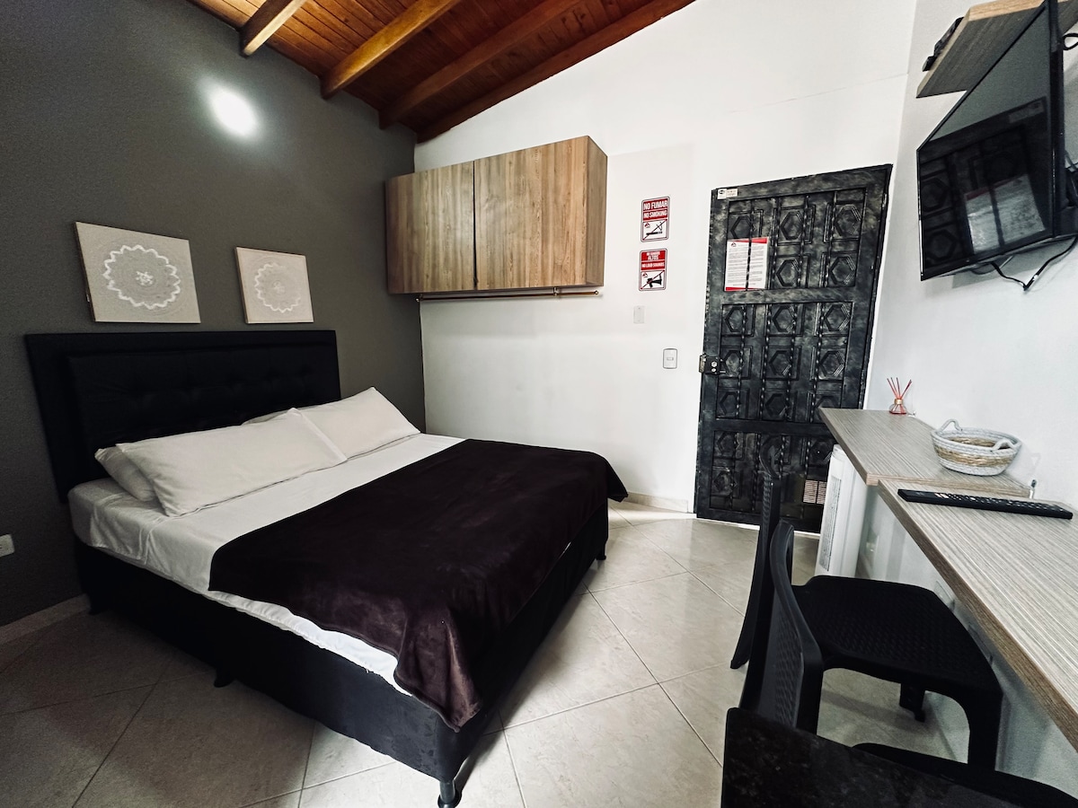 Loft 43 Medellin Increible apartaestudio Ideal para quienes disfrutan trabajar desde cualquier lugar. Cuenta con una cama Queen Size, escritorio y silla de trabajo, cocina integral dotada, baño privado con ducha de agua caliente, televisión de 43 y conexión WIFI. Los elementos básicos de cocina puedes solicitarlos en recepción, Aceite, vinagre Sal y pimienta puedes comprarlo en en una tienda cercana. Para registrarse es necesario presentar un documento de identificación fisico válido.