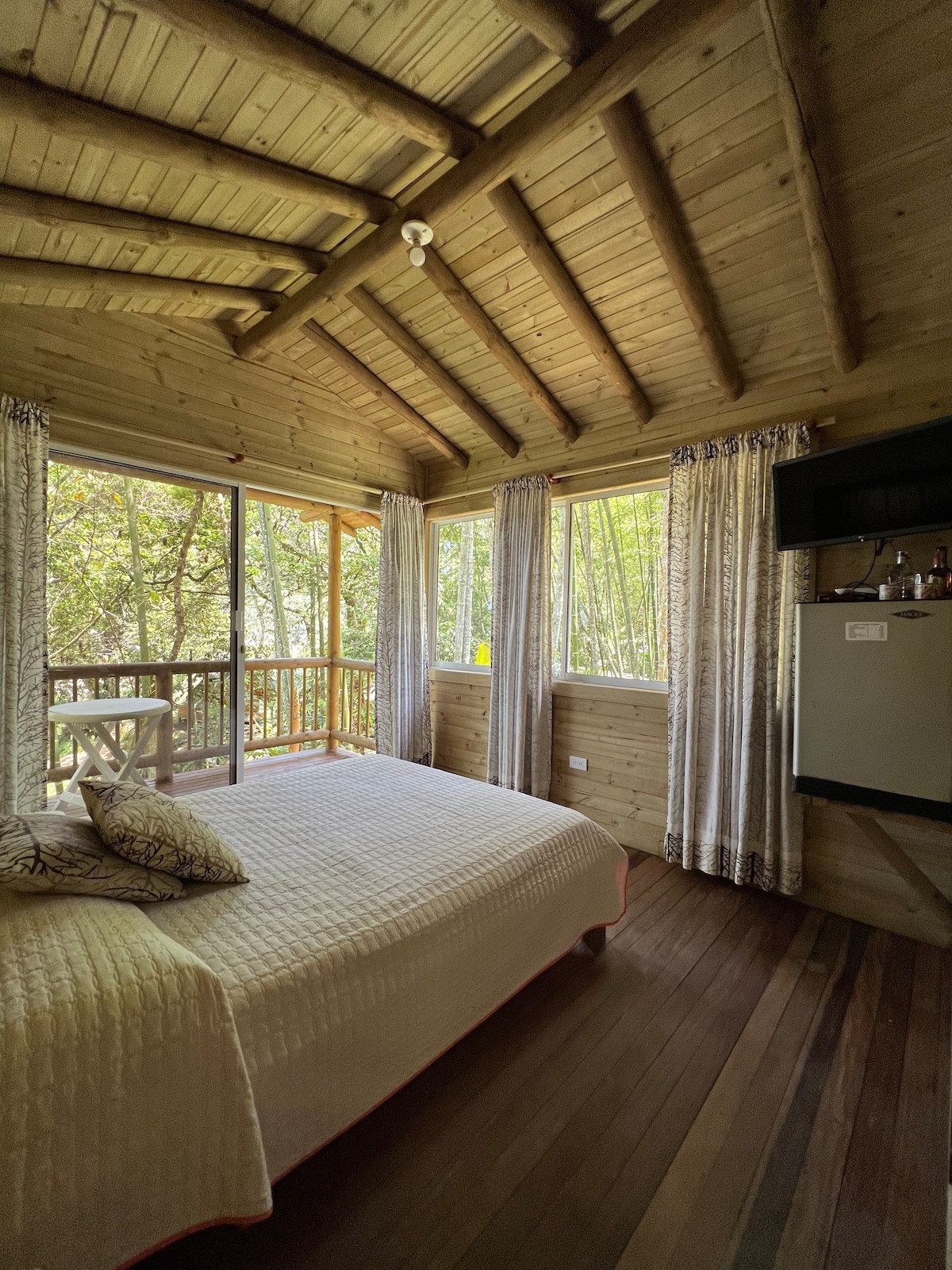 Rainforest Refuge Chalet in Guarne, Antioquia, Medellín, surrounded by majestic mountains and the soothing sounds of birds and butterflies. Enjoy breathtaking sunrises and reconnect with nature from our cozy cabin's spacious deck, where you can sip coffee and take in stunning views. Inside, a glass-ceiling bathroom invites you to unwind while the fully-equipped kitchenette enhances your stay. With outdoor furniture for al fresco dining and serene paths to explore, you’ll feel in heaven!