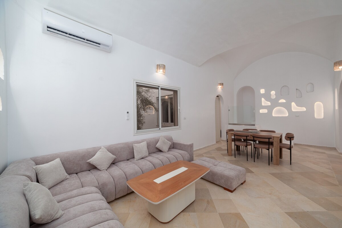 Nouveauté sur L'île de Djerba ❣️ PETIT DÉJEUNER INCLUS :) Située dans la ville de Midoun et à seulement : - 5 minutes en voiture de la mer - 10 minutes en voiture du Golf de Djerba Cette villa d'exception marie subtilement l'architecture traditionnelle tunisienne et un design moderne. Elle se compose de 3 suites élégantes, chacune avec sa salle de bains privative, une salle à manger conviviale, une cuisine entièrement équipée et un splendide rooftop pour admirer le coucher de soleil.