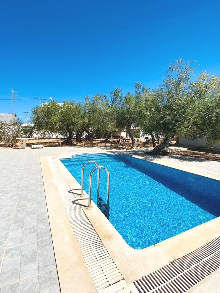 Villa Hnia à Houmt Souk a un emplacement stratégique avec accès facile à la plage, à l’aéroport,commerces de proximité à pieds. Cadre idéal pour des vacances reposantes; intimité assurée grâce aux hauts murs de la maison Grand jardin, piscine 4*9m avec fontaine et jets massant.Barbecue et cuisine externe. Equipée de bancs, d'une entrée,1 séjour luxueux et confortable, avec baies vitrées, 3 chambres climatisées avec cnx dont 1 suite parentale,1 cuisine équipée,1 buanderie avec machine à laver.