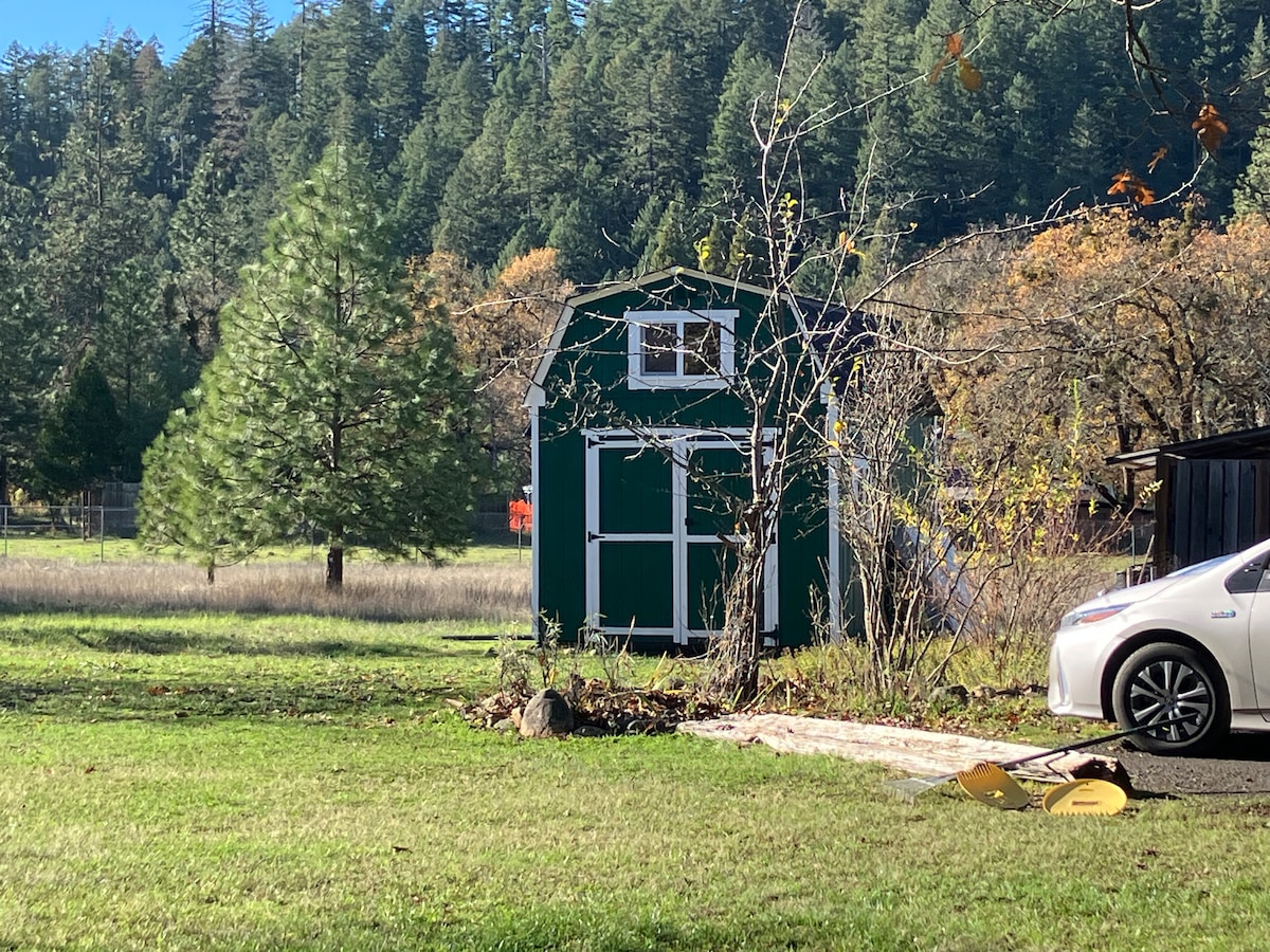 Take it easy at this unique and tranquil small studio cottage getaway. Our guest cabin is perfectly located minutes off the 5 freeway and just 3 miles from downtown Ashland's Shakespeare Festival, Plaza shops, beautiful Lithia Park and Restaurants. Venture to local lakes including Crater Lake, historic Jacksonville, and wineries in the picturesque Rogue Valley from our central location. Enjoy the privacy of our gated property with peaceful surroundings! Pets accepted with pet fee.