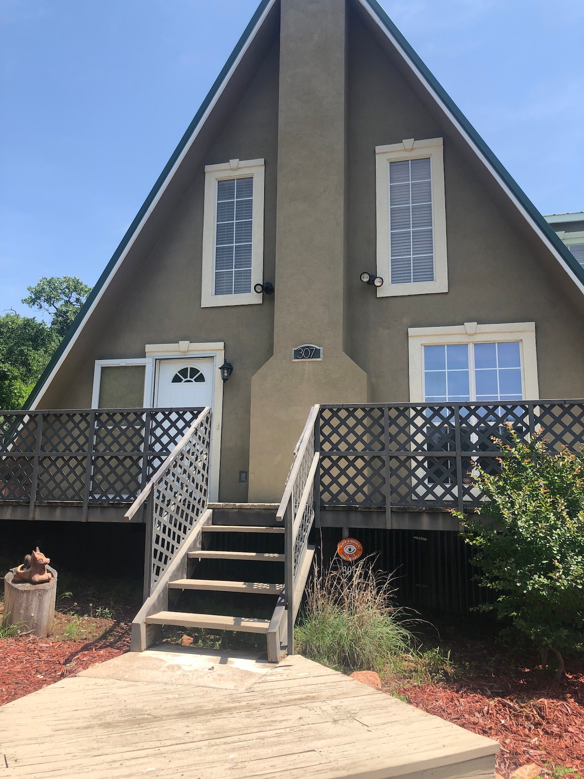 This cabin is rustic yet elegant, rock interior wall in kitchen with apron sink, butcher block cabinet tops and stainless appliances. There is a grand rock wood fireplace, stained concrete floors, deep soaking tub in master bath. The cabin has a bedroom and bath downstairs and bedroom and bath upstairs. Features a 4-seater hot tub in private covered patio. Eagles Nest sits in the foothills of the Wichita Mountains which gives it that amazing "cabin feel." Eagles Nest is a home away from home.