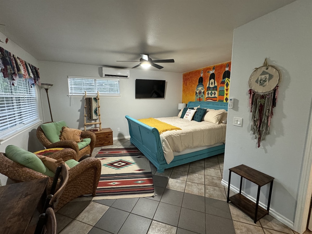 Welcome to Native Sun in Medicine Park! This unit has been a family favorite and is located above our private garage in the heart of Medicine Park. Decked out in Native American style with a deck to enjoy coffee in the morning or sunsets in the evening. Small kitchenette w/ two burner range and Toshiba Microwave Air Fryer Oven combo can accommodate small cooking needs. Full bathroom with tub, smart TV, and WiFi are just some of the amenities you will enjoy during your stay. NOT PET FRIENDLY