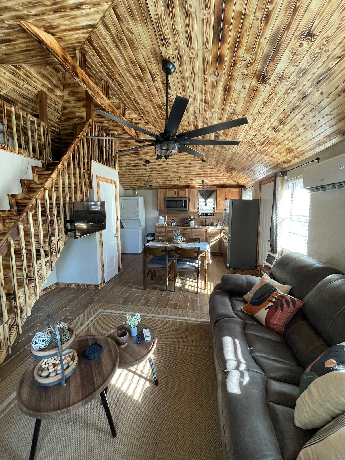 This cabin is rustic yet elegant, rock interior wall in kitchen with apron sink, butcher block cabinet tops and stainless appliances. There is a grand rock wood fireplace, stained concrete floors, deep soaking tub in master bath. The cabin has a bedroom and bath downstairs and bedroom and bath upstairs. Features a 4-seater hot tub in private covered patio. Eagles Nest sits in the foothills of the Wichita Mountains which gives it that amazing "cabin feel." Eagles Nest is a home away from home.