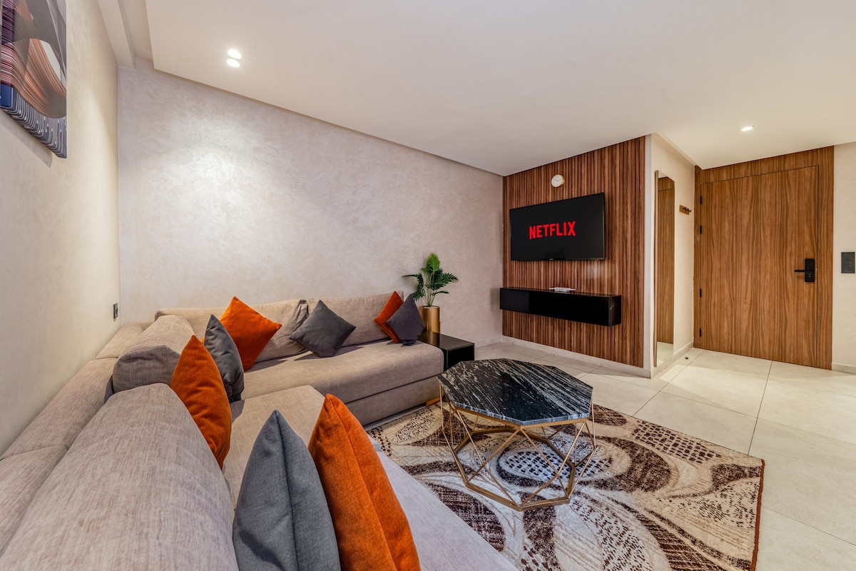 Appartement ensoleillé, chaleureux et hors pair, idéalement situé dans une résidence neuve en plein coeur du quartier mythique, Guéliz, avec une vue sur le Mall Carré Eden, très bien asservi et proche de toutes commodités. Moderne avec une touche marocaine, il est aménagé pour que vous vous sentiez chez vous, c'est le point de départ idéal pour profiter des merveilles de Marrakech ainsi que pour y séjourner pour un voyage d'affaire. Il est également parfaitement adéquat au télétravail.