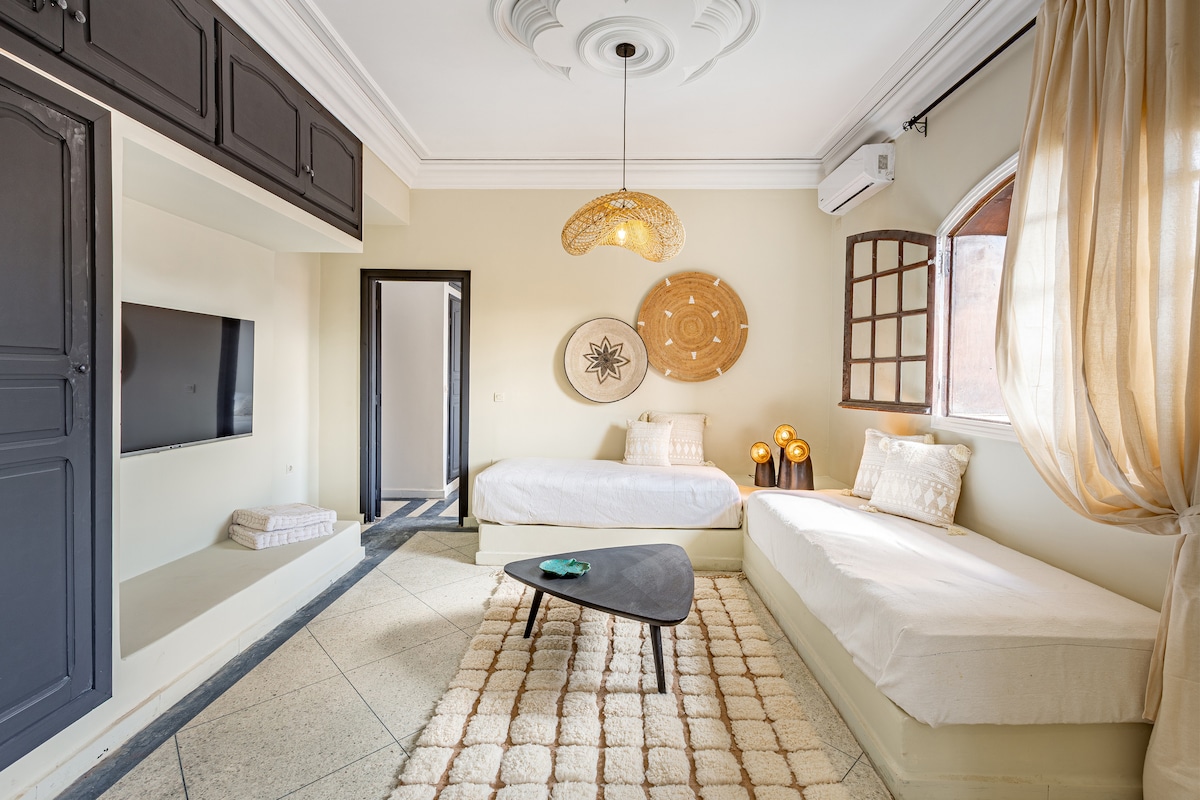 L'appartement entièrement privé se compose d'une chambre et deux salons à l'architecture typique marocaine avec un puit de lumière au plafond, d'une salle de bain privé et d'une cuisine entièrement équipée. L'appartement est climatisé. Il est en face du Palais Bahia et à 5 min à pied de la place JAMAA EL FNA et de ses souks. L'appartement est parfaitement isolé du bruit grâce aux fenêtres à double vitrage. Il se situe au premier étage.