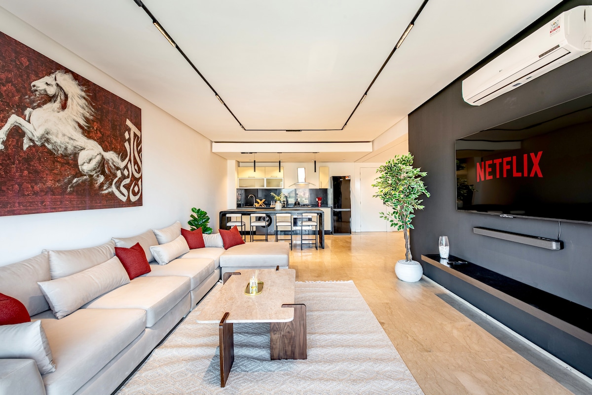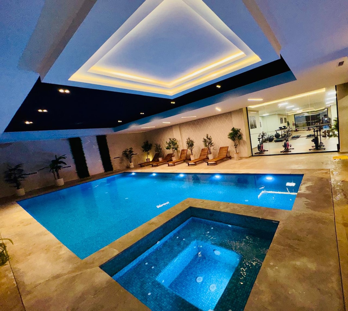 Our apartment is conveniently located in the heart of Marrakech. The train station, numerous cafes, restaurants, grocery stores, and supermarkets are all within walking distance. The airport is just a 12-minute drive away, making it ideal for travelers. • The property offers High-speed Wi-Fi, Netflix & IPTV, air conditioning, an indoor pool, a fitness center, private, covered parking, and 24/7 security & surveillance.