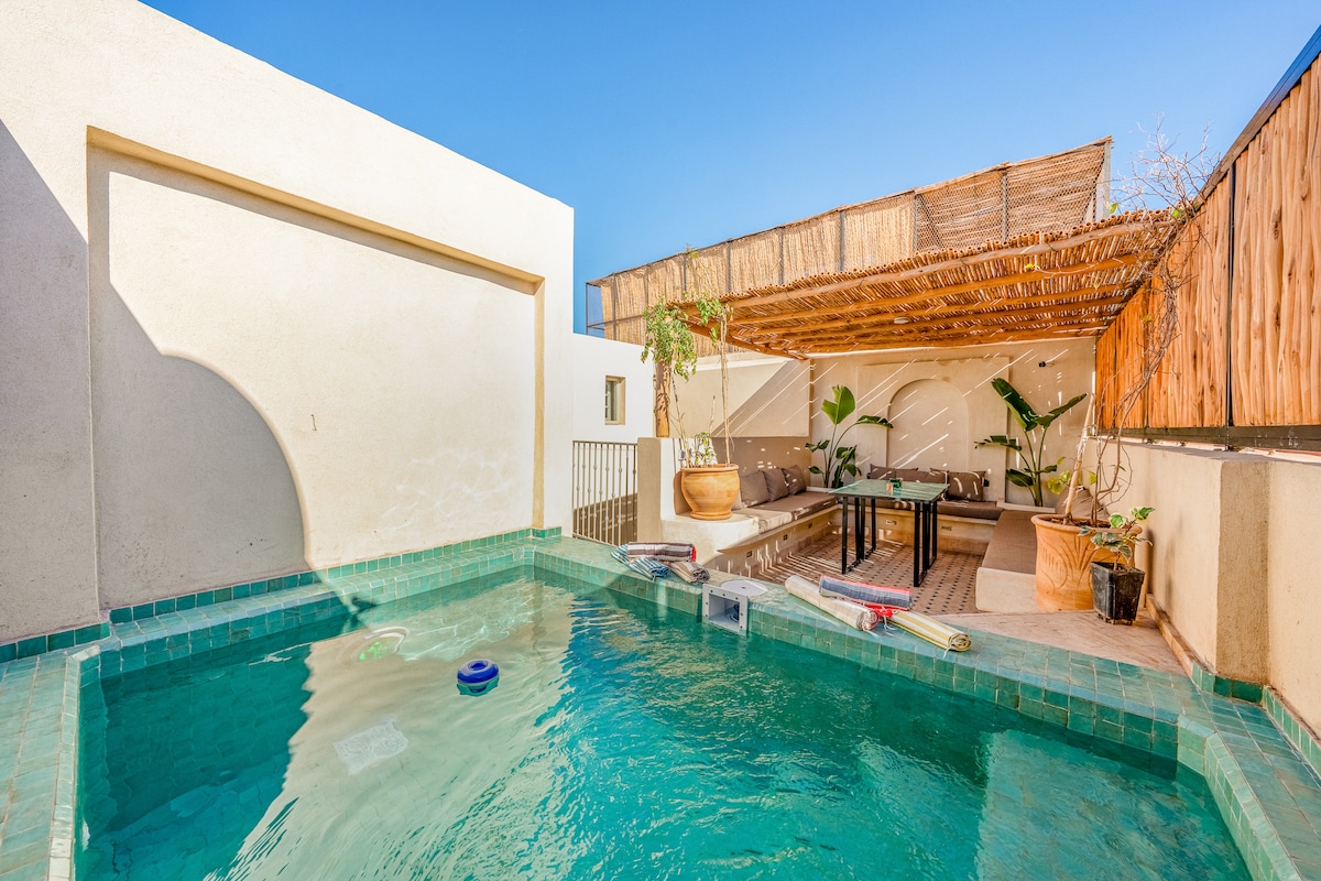 Magnificent Riad on 3 levels in the heart of the medina in a quiet alley, ONLY 4 MIN WALK from the famous Jamaa Al Fna square, - 3 suites with private bathroom - Private swimming pool - Outdoor terrace with view of the Atlas Mountains Zineb, the housekeeper, is on site daily to ensure everything runs smoothly. She also offers a delicious Moroccan breakfast every morning upon request, for €5 per person, A perfect blend of charm and location between Jamaa El Fna Square and the Bahia Palace,