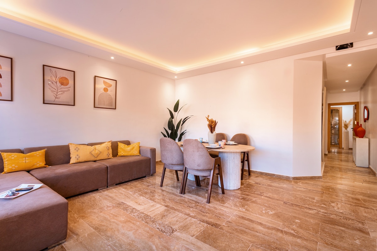 Séjournez en plein cœur de Marrakech dans notre appartement 2 chambres et 2 salles de bain. Profitez d'Une literie Simmons haut de gamme, WiFi haut débit (fibre optique) et d'une décoration moderne avec un bassin privé. Cuisine entièrement équipée, baignoire élégante, et douche italienne. À quelques pas de la place Jemaa el-Fna, du Plazza, et du Carré Eden. La piscine n’est pas chauffée. NB: Les couples marocains non mariés ne sont pas autorisés.