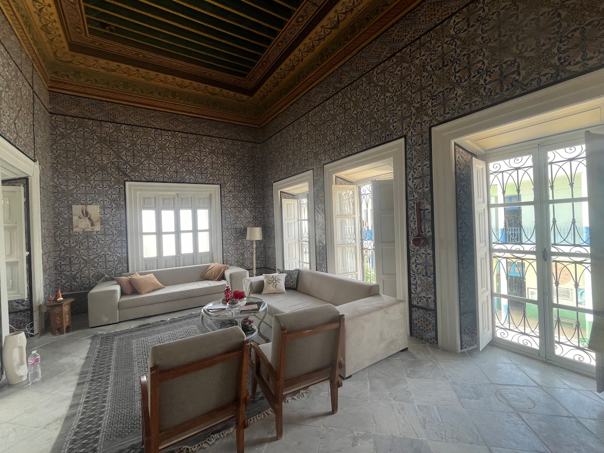 Une chambre dans un cadre historique unique et lumineux datant du 19ème siècle offrant un séjour authentique pour les voyageurs en quête d'histoire et de tranquillité avec une immersion artistique: -Chambre spacieuse et élégamment décorée, serrure, bibliothèque vue sur medina( SDB partagée) -Accès aux autres pièces -Accès aux concerts et aux evennements culturels de la maison -possibilité de réservation petit Déjeuner, Ateliers cuisine/artisanat/peinture/musique , guide tour, transfert aéroport