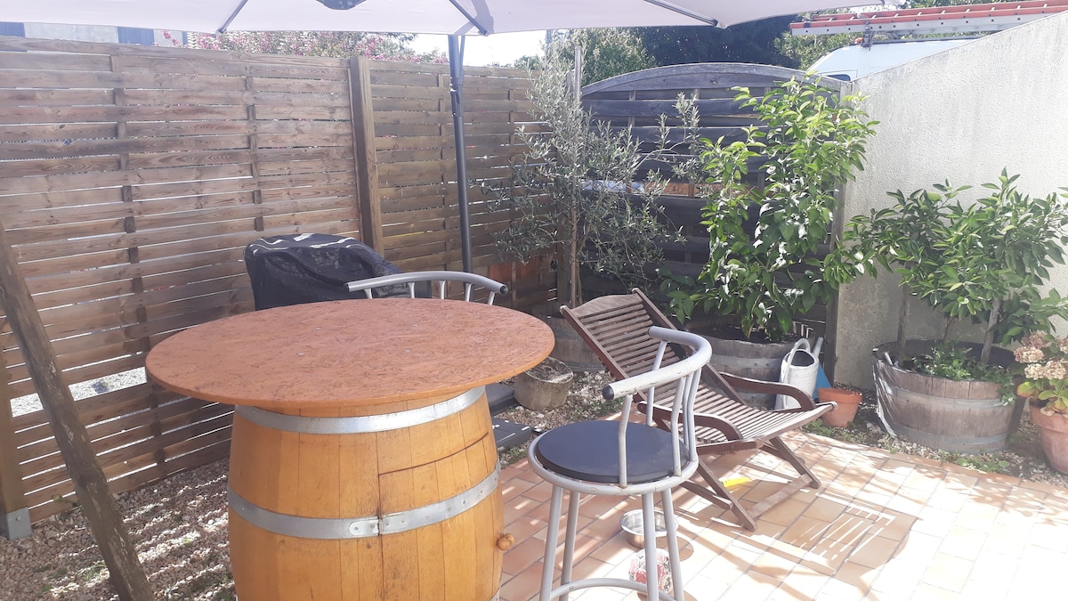 A 5mn de royan, studio complètement rénové, de plain pied avec terrasse et petit patio. pour 2 voyageurs. Parking privé, proche commodités calme et bien équipé. Draps et serviettes fournis à partir de 2 nuits, pour 1 nuit je demande 10 € pour le nettoyage. le logement est mitoyen à mon domicile mais en retrait, préservant l’intimité. location pour un minimum de 2 nuits, en période estivale.
