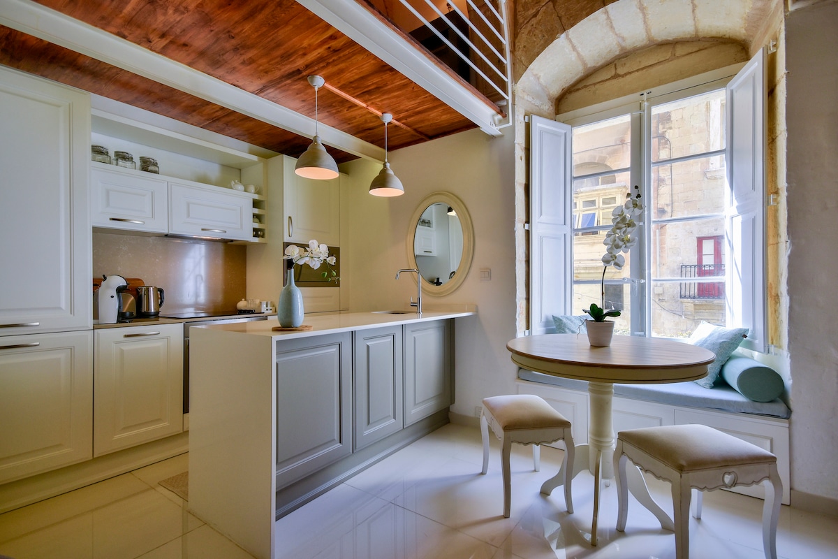 The fully furnished suites are located in the historic capital city of Malta, Valletta. The combination of the traditional style of the 300 year old townhouse, with the modern interiors of the space creates an atmosphere like no other. They are on a corner close to Castille Palace and therefore enjoy plenty of light since they overlook two charming Valletta street. Access to views of the Grand Harbour from terrace on the 4th floor.