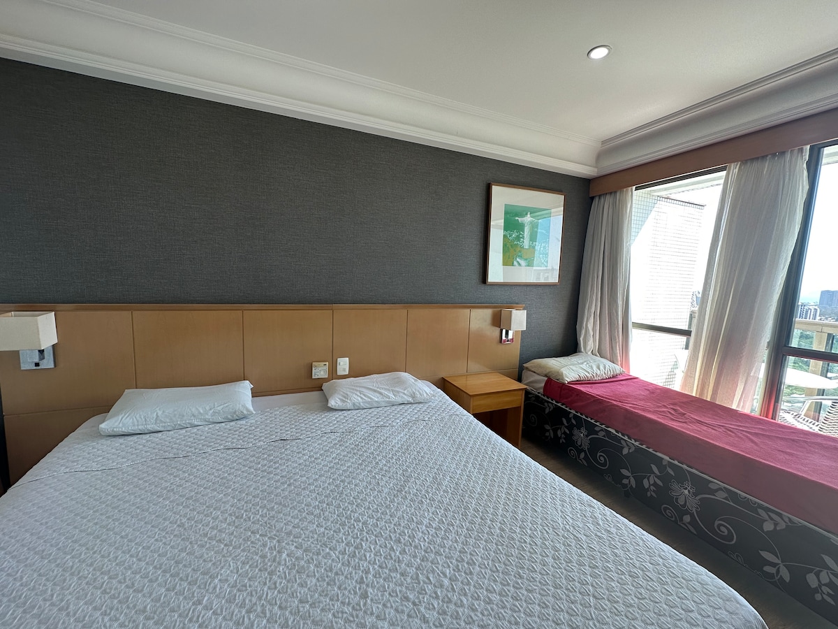 Espaço aconchegante com duas camas de solteiro e uma ótima varanda no Mediterrâneo Flat Barra da Tijuca que está localizado na área central do bairro, de fácil acesso à praia a pé - altura do posto 5/6. Próximo shopping center (Barra Shopping e outros), padaria, mercados, bares, restaurantes e lanchonetes . O Flat conta com Wi-fi, Ar Condicionado, TV Smart, Mini Cozinha com cooktop de indução (uma boca), frigobar, cafeteira, microondas e forno elétrico. O condomínio conta com ampla área de lazer