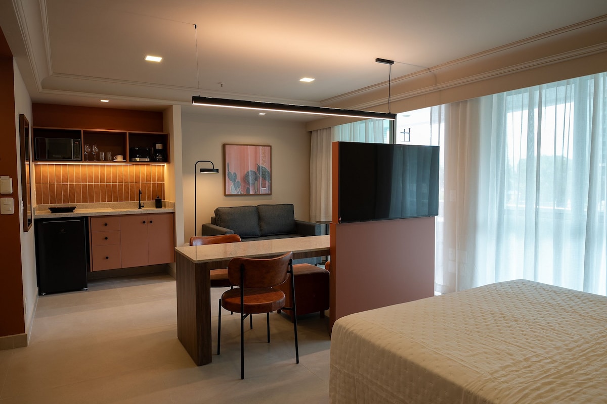 One block from the beach — host speaks Deutsch, English and Español. Lugar tranquilo, muito verde, varanda com vista, rede e sol da manhã. Sala integrada com sofá-cama, TV e split. Quarto com cama queen, closet e cofre. Condomínio com piscina aquecida, sauna, restaurante, mercadinho e estacionamento. 📍 Bem localizado: próx. mercados, shoppings e praia, com acesso de carro, metrô, BRT, Uber e barco-táxi. ⭐ IDEAL PARA: • Casais • Famílias pequenas • Executivos • Trabalho remoto + lazer