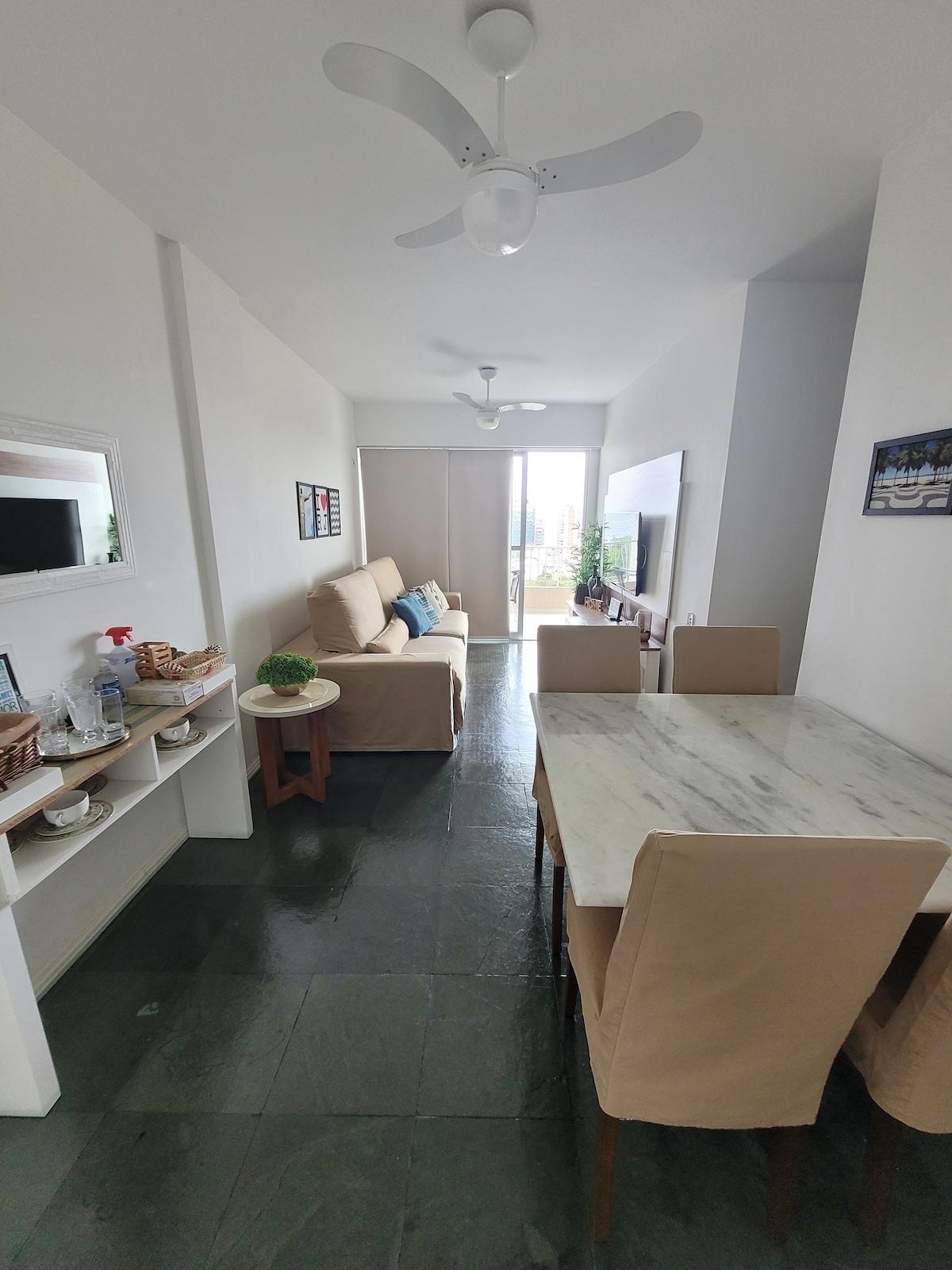 Amplo sala e quarto varanda, decorado, totalmente equipado Internet fibra optica alta velocidade, Wi-Fi, 2 smart tv's. na sala 55" no quarto 46", sala com ventilador de teto sofá cama, quarto cama de casal, ar condicionado split, agradavel escritorio impressora, cozinha americana geladeira,fogão, micro ondas, torradeira, liquidificador, máquina Nespresso, utensílios,secador de cabelos,máquina de lavar roupas,ferro e tabua de passar roupas,charmosa varanda com vista lateral da praia e piscina.