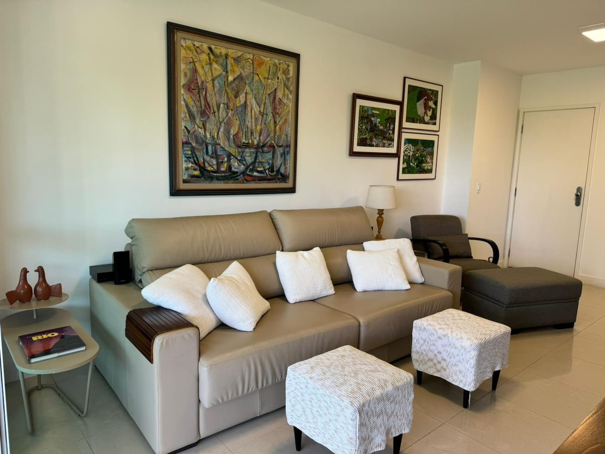 One block from the beach — host speaks Deutsch, English and Español. Lugar tranquilo, muito verde, varanda com vista, rede e sol da manhã. Sala integrada com sofá-cama, TV e split. Quarto com cama queen, closet e cofre. Condomínio com piscina aquecida, sauna, restaurante, mercadinho e estacionamento. 📍 Bem localizado: próx. mercados, shoppings e praia, com acesso de carro, metrô, BRT, Uber e barco-táxi. ⭐ IDEAL PARA: • Casais • Famílias pequenas • Executivos • Trabalho remoto + lazer
