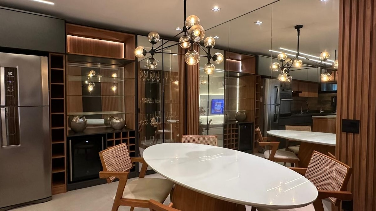 Sala,2 Quartos,(Ocup.04 pessoas com possibilidade de 05 em Colchão Extra) ,Ar Split em todos comôdos ,Cozinha equipada.Wifi Alta Velocidade- Smart TV 55" com acesso a Canais a cabo.Acesso (senha dos hóspedes)Net Flix, Globoplay,etc. Lavadora e Secadora Roupas disponível. Berço, cadeirinha alimentação e Pratinhos para bebes. Telas de Proteção em todas Janelas. Pet Friendly (Pequenos animais - Max 12 Kg) Temos cumbuquinhas de água e ração.