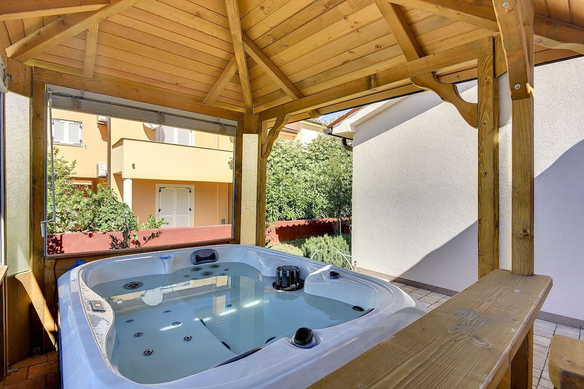 Casa Percan is a new and modern holiday home with whirlpool. A large swimming pool with deckchairs is available for use right across the street. It's located in a quiet part of Premantura. The holiday home consists of 2 bedrooms (one bed 160 x 200 and two bunk beds), a living room, a fully equipped kitchen and 1 bathroom. There is a free private parking. In the yard there is a summer kitchen with a grill on gas, seating area, and also loungers for relaxing.