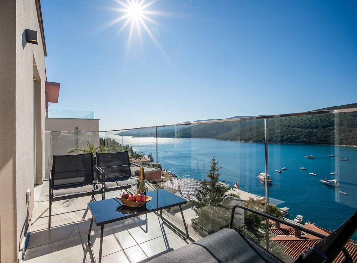 Stunning views of Rabac Bay from your balcony This exclusive front-facing apartment has a glass balcony with a stunning view of the centre of Rabac, Rabac Bay and harbour. Start your day with a coffee in hand watching the town wake up and end off with a glass of wine watching the sun set over the crystal blue sea.