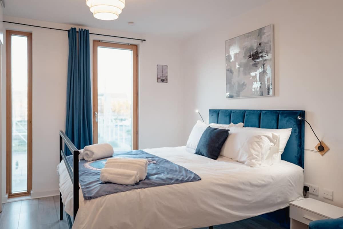 This spacious themed, bright and stylish riverside apartment features 2 bedrooms with king sized beds and own workspace and 2 luxurious bathrooms, perfect for up to 4 guests. Enjoy a cosy living area, fully equipped kitchen, and dining space ideal for unwinding after a busy day. With free parking, a peaceful marina setting, and thoughtful touches throughout. Perfect for long stays, holiday escapes, and contractors looking for a comfortable home away from home. Contact us and get discounts!