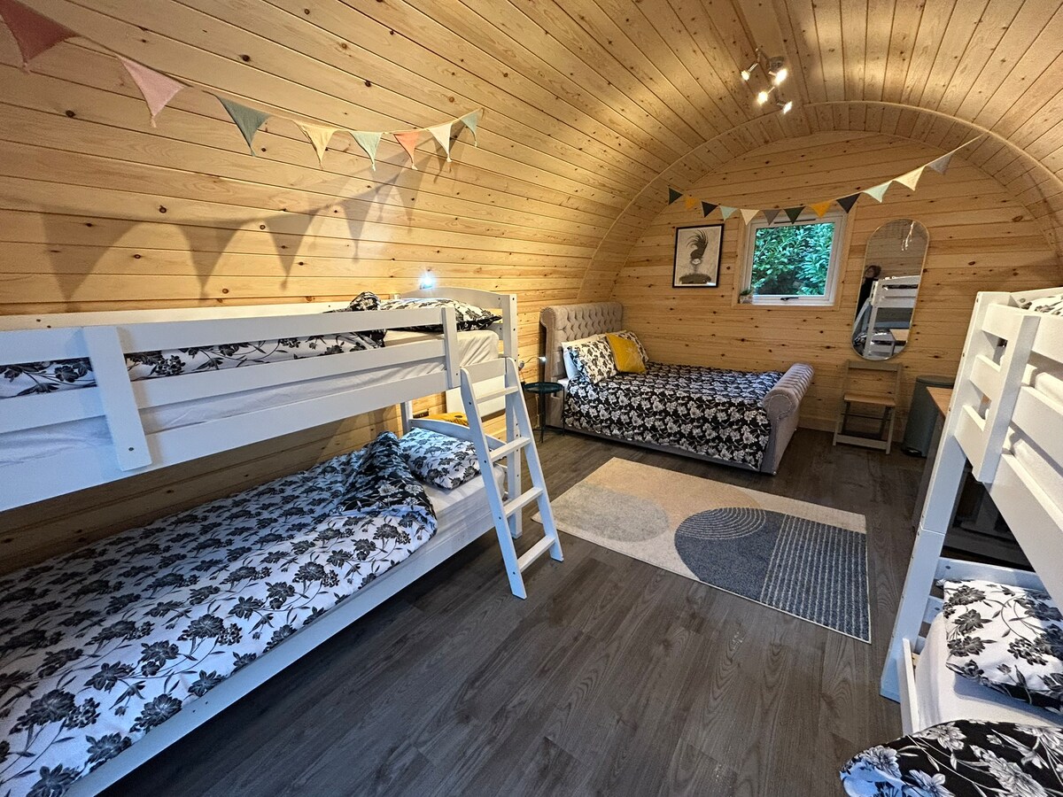 Experience glamping at its very best with our luxurious pod which comfortably accommodates 4 people, heated for all year round use and ideal for a relaxing family staycation in this beautiful countryside location. We offer the unique opportunity of sharing your space with our delightful alpacas, cheeky pigs, and sweet chickens and ducks, who delight in being fed by our guests. Heated swimming pool open from May-Sep only.