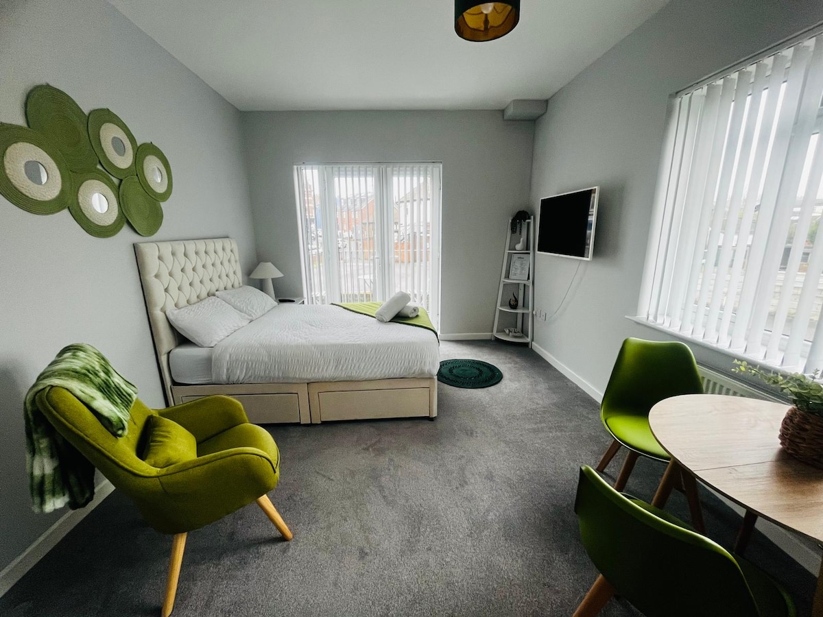 Modern 1-bedroom apartment with stunning views, perfect for up to 4 guests. The bedroom features a comfy double bed and wardrobe, while the open-plan kitchen, dining, and living area offers a double sofa bed, Smart TV, Wi-Fi, and board games. Enjoy free parking and a bright, stylish space just a 1-minute walk from ASDA. Central location ideal for exploring, relaxing by the river, or working away from home.