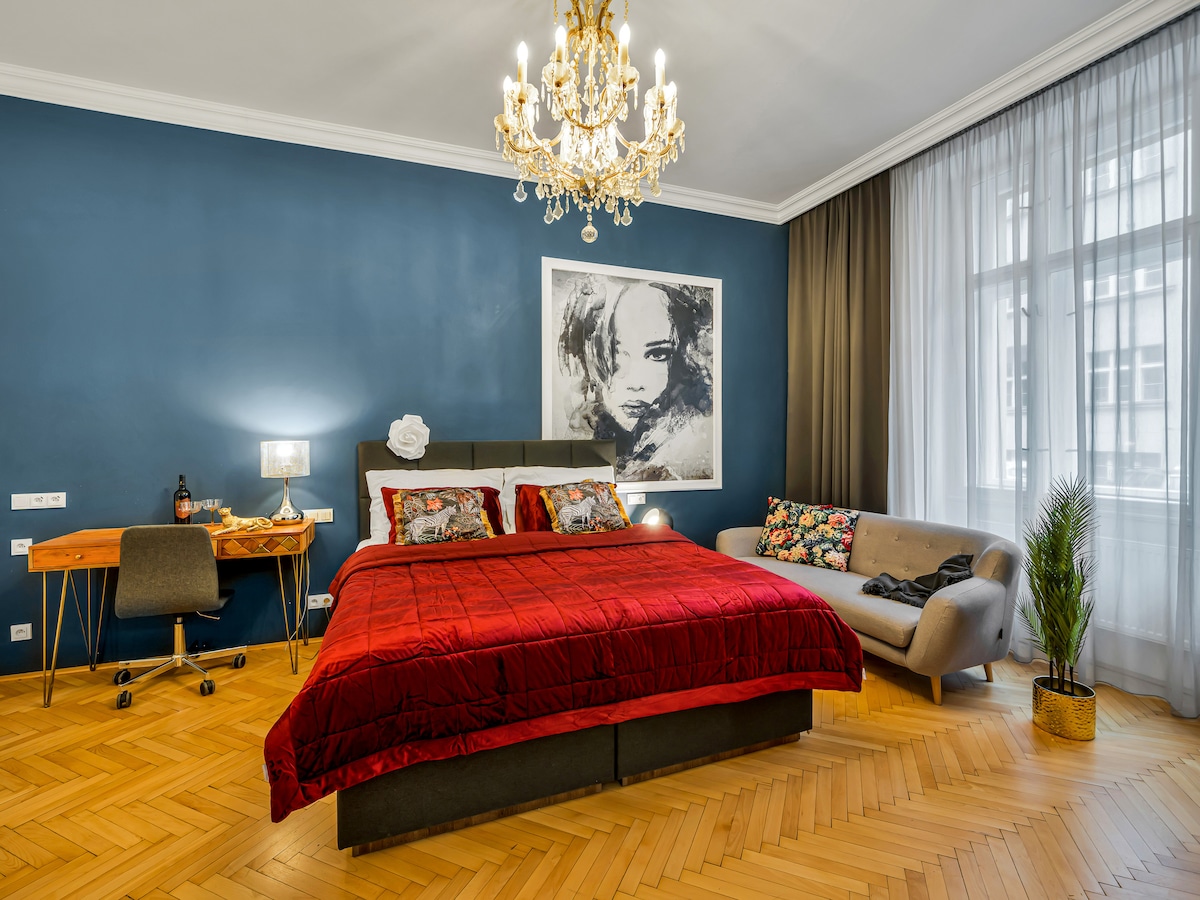 Brew an espresso in a crisp kitchenette to take onto the balcony with romantic views of the city from an Art-Nouveau building. Chevron wood floors, traditional accents, and clean-cut furnishings lend a placid vibe to this light-doused studio. This beautiful studio in an historical residence from early 20th century will make you feel cozy and like at home. It has a wonderful view of the Prague Castle from the balcony.