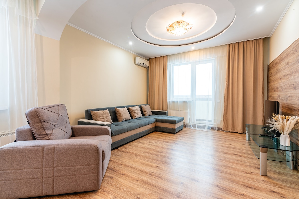 Spacious, tidy and cozy 3-room apartment near the largest shopping mall in Almaty - Mega and the Park of the First President, from where you can enjoy a view of the breathtaking mountains. The apartment has everything you need for a calm and comfortable stay: a spacious bath with towels, second separate bathroom, high-speed internet for remote work, a kitchen with everything for cooking, a large hall in minimalistic style and two spacious and isolated bedrooms.