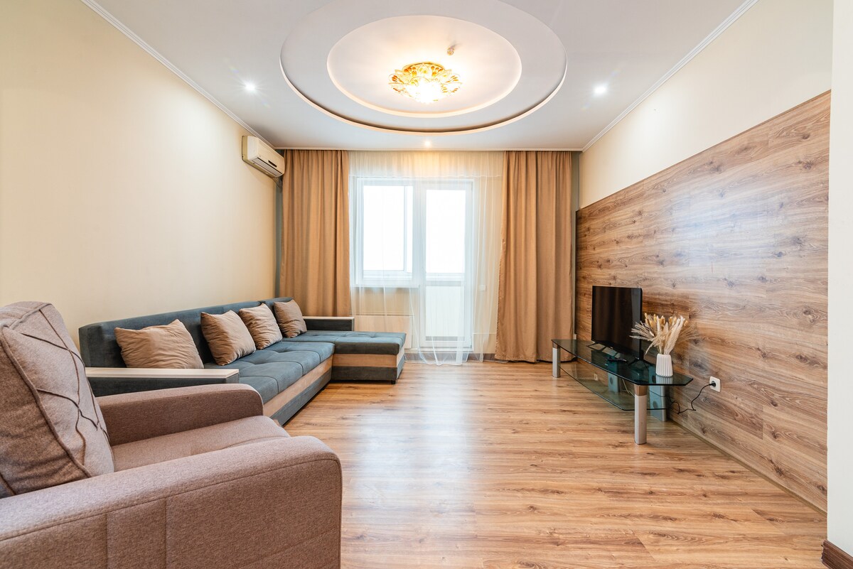 A stylish modern flat is a great option for leisure and business trips. Located in the center of Almaty, 100 m from Abaya Street. Nearby are the circus, the Sports Palace, the Republic Palace, the central stadium, the cable car, Lermontov Theater, Mukhtar Auezov Theater. The studio is fully equipped for 2 people: a sofa, a double bed, a kitchen area with necessary appliances, a bathroom, a large TV and high-speed WiFi. Windows with mountain views and a quiet courtyard.