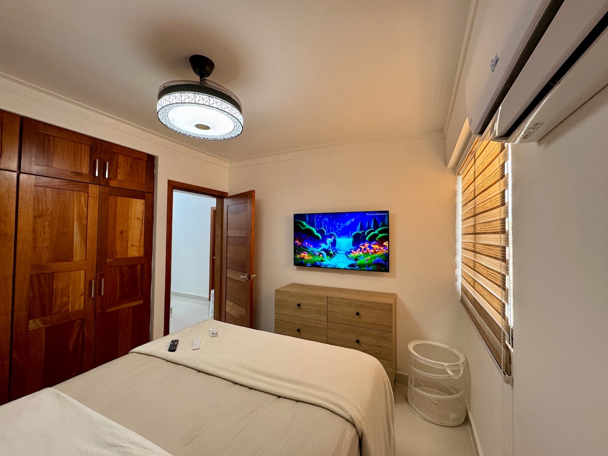 Cozy first floor apartment 1B with high-speed internet, flat-screen TV, fully equipped kitchen, hot water with good pressure, air conditioning in the bedroom, and an inverter.1bedroom 2bathroom, Located in front of a supermarket, near Megacentro Mall, the metro, and restaurants. The building has a beauty salon, massage center, and law office. Important: no private parking, electricity is extra, and no parties or guests outside the reservation are allowed.”