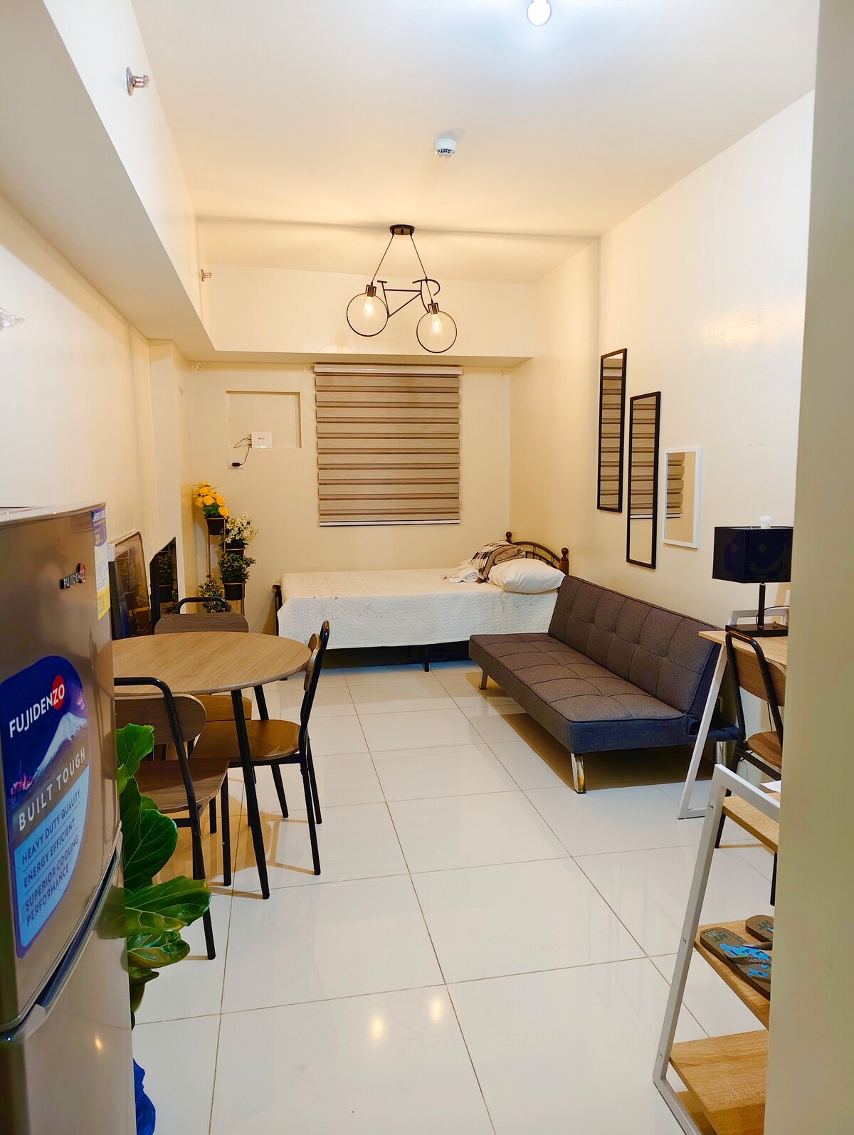 Relax with the whole family, relatives or friends at this serene place with an amazing view. 1 BR include - Fully equipped kitchen - Complete dining utensils - Comfortable Sofa bed in the living area - Portable fan & window A/C, smart TV & wi-fi - Double bed w/ side tables - Spacious wardrobe - Shower heater & bidet Amenities include - Sauna - Gym 1 BR w/ avail pay parking 24/7 Live Security & CCTV • 3-5 mins away from Cathedral, SM Baguio, Burnham Park • 1 min away from Pink Sisters