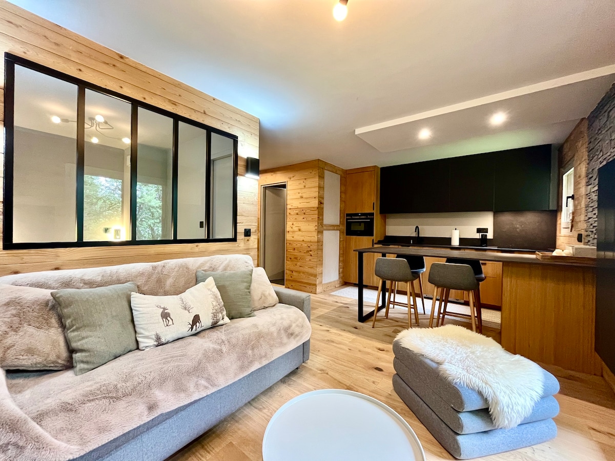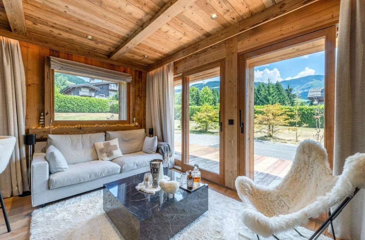 Luxury designer flat (entirely refurnished) in Megève city center - 105 m2 : - 3 Bedrooms - 1 Living Room - 1 Dining Room - 2 Bathrooms (1 independent and 1 open bathroom located in a bedroom) - 1 independent toilet - Fully equipped open kitchen - Wifi - Balcony - 2 outside parking lots - Private entrance - Ski closet (Ski Boot dryer) - Ski bus stop in front of the apt Megeve city center is at 400m by walk. 500m from Le Chamois ski lift, Grocery shops within 200m.