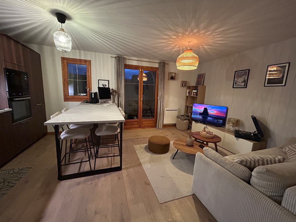 Nous vous accueillons dans notre chaleureux Appartement, vue Montagne, baptisé The Wolf, d'environ 40m2 refait à neuf en 2019. Comprenant même "un pas dans le vide" au 1er étage comme celui de l'aiguille du midi ! A 100 Mètres des pistes de ski et 10min en voiture de Chamonix. Vous vous sentirez comme chez vous ! We are enjoy to welcome you in our cozy appartment name's The Wolf, around 40m and renoved in 2019, Mountain View. Just next to the slopes 100m and the city Chamonix 10min drive!