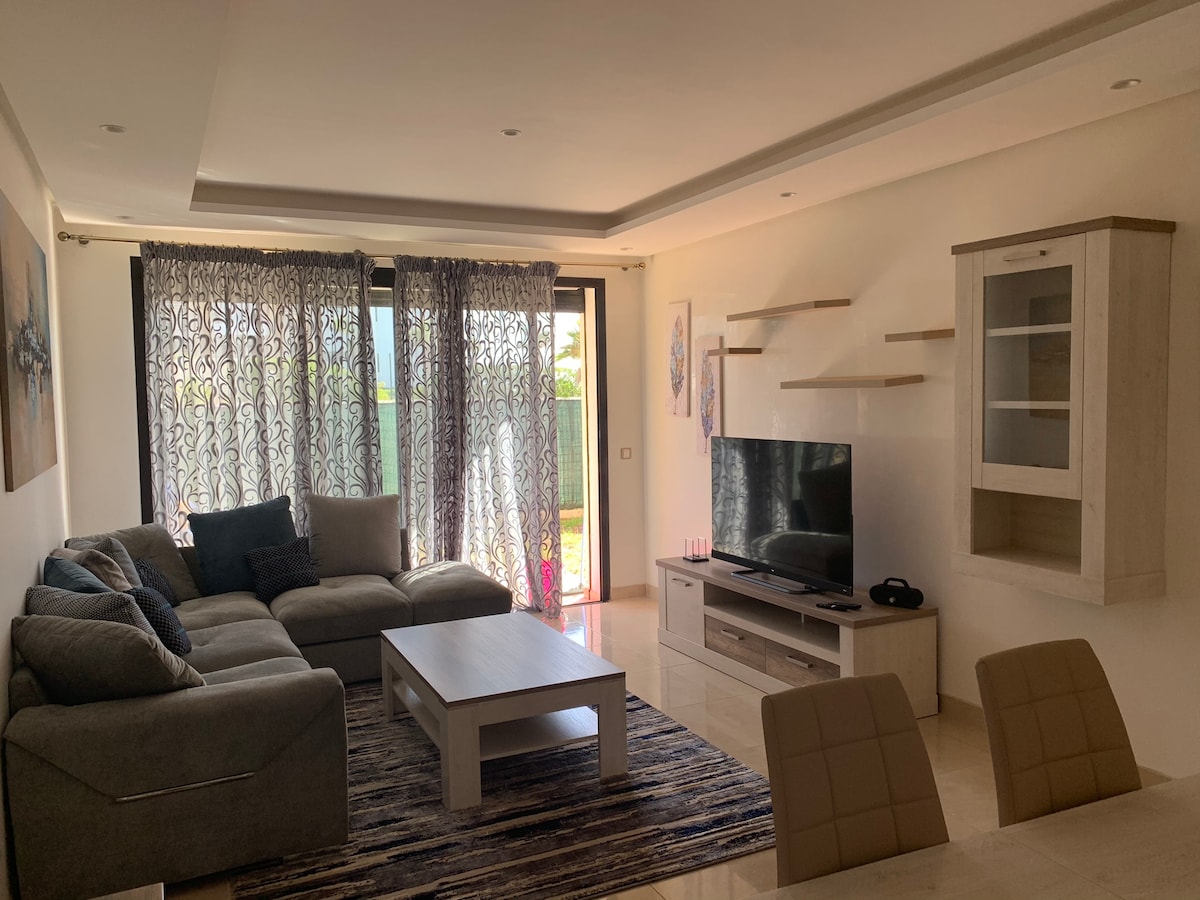 Bright 120m² apartment with 3 façades and all-day sunlight. Just 5 min from the beach, 10 min from Kenitra, and 3 min from Marjane. Enjoy a cozy living room, private bathroom, dedicated workspace, and fast Wi-Fi — perfect for families, couples, or remote workers. Near cafés, markets, and the mall, with easy access to Rabat (40 min).